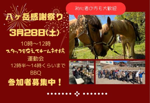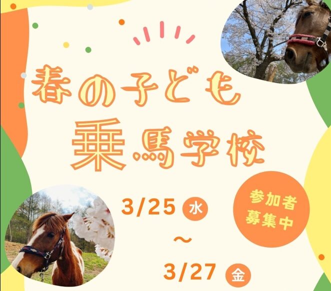2026年3月25日(水)~3月27日(金) 子ども乗馬学校 受付開始 2026年12月25日からになります。 ご参加ご希望の方メールまたはお申込フォームより受付いたします。 大変ご好評いただいております為お早めにお申...
