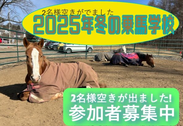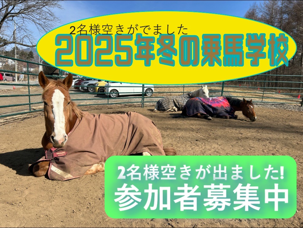 【2025年冬の子ども乗馬学校】2名様空きができました! 2025.09.28 Tweet Share 冬の子ども乗馬学校 2025年12月25日(木)~27日(土) 2名様空きが出来ましたので参加される方を募集中です! ご参加ご希望の方は yatsugatake@canacan.jp から受付をお願いいたします。 〇2025冬の子ども乗馬学校ご案内 〇2025子ども乗馬学校スケジュール Tweet Share